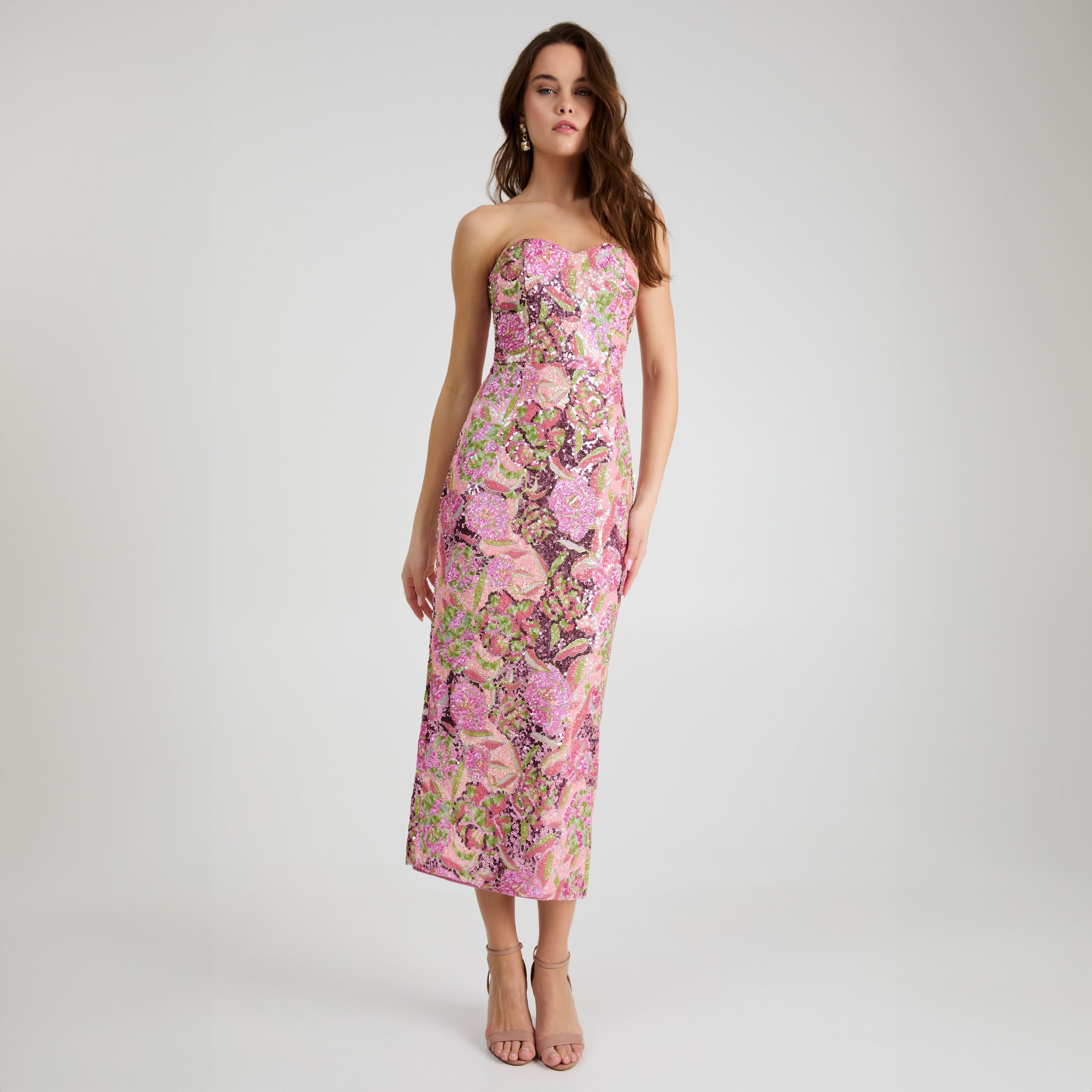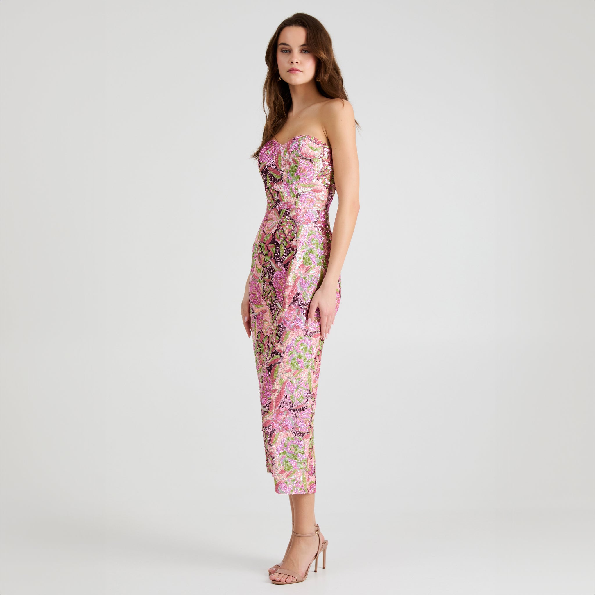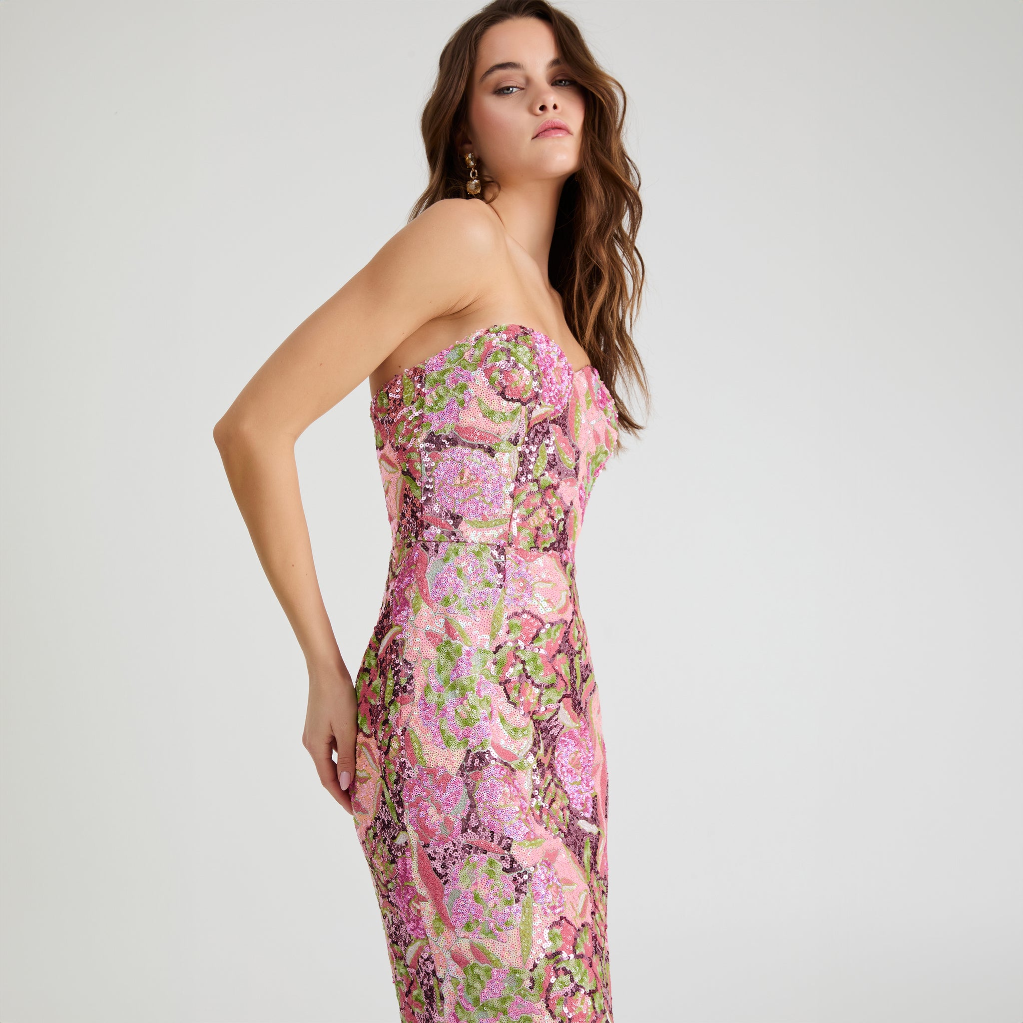 STRAPLESS SWEETHEART FLORAL SEQUIN GOWN