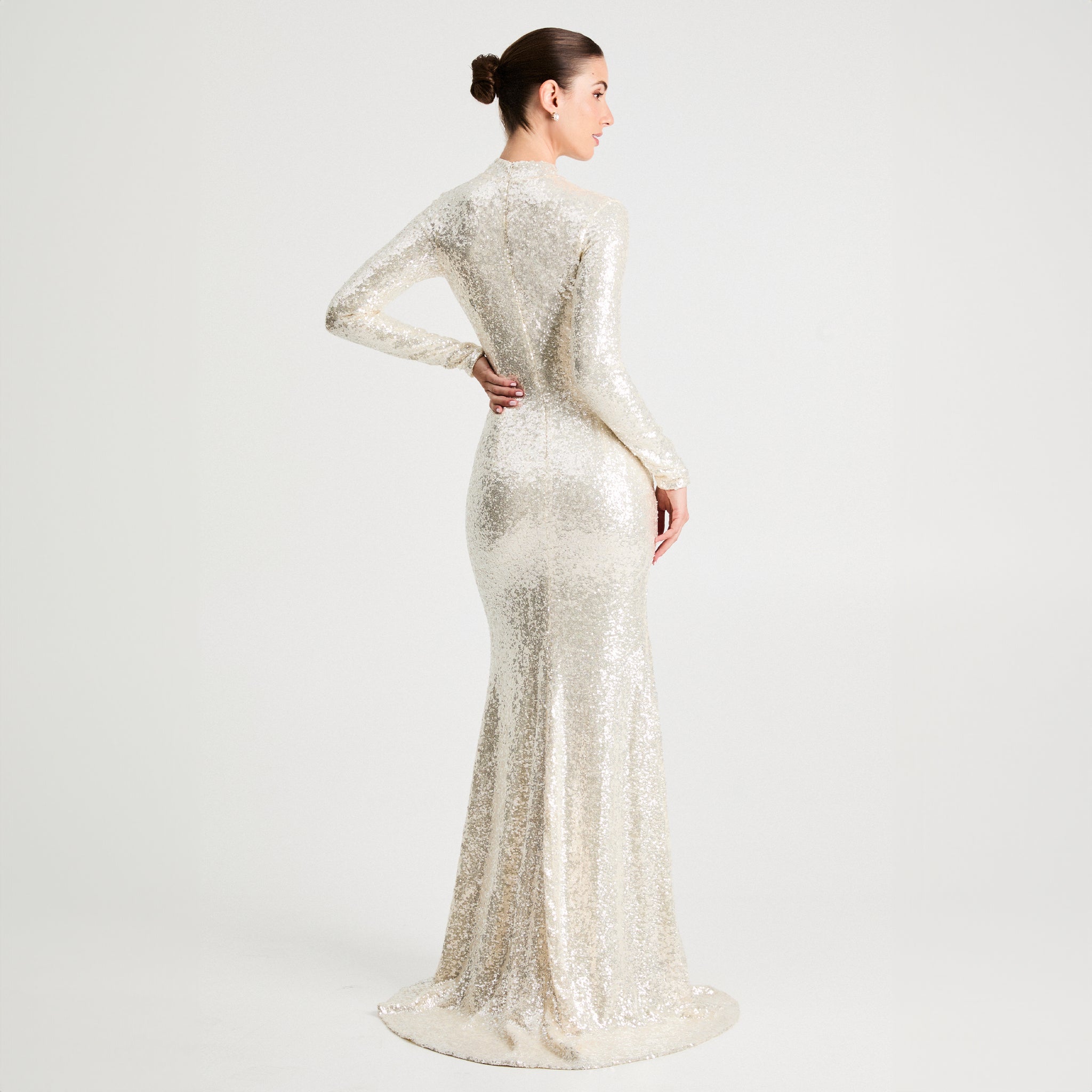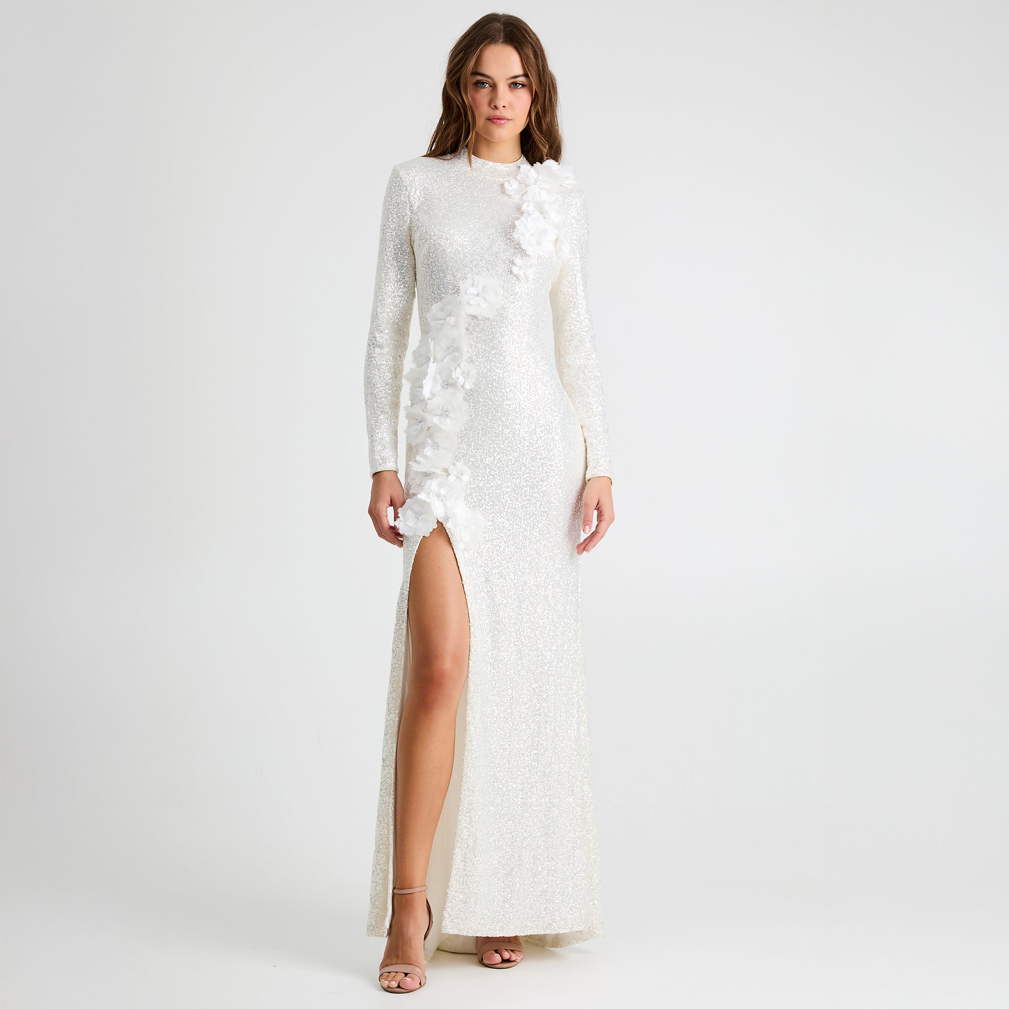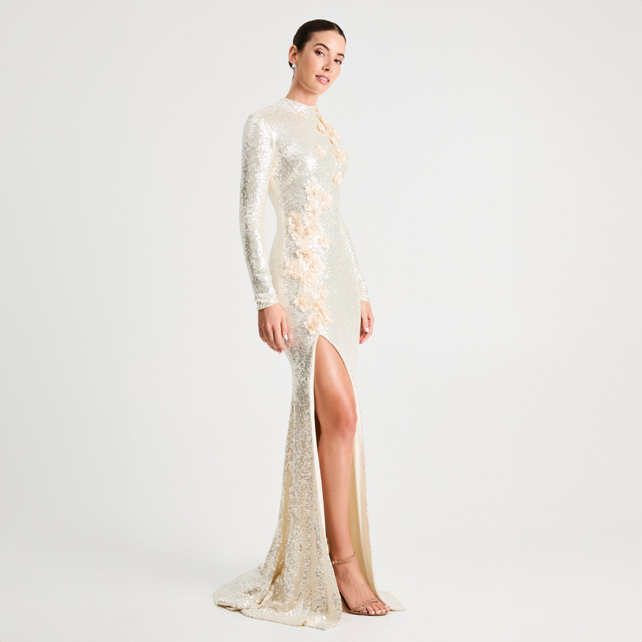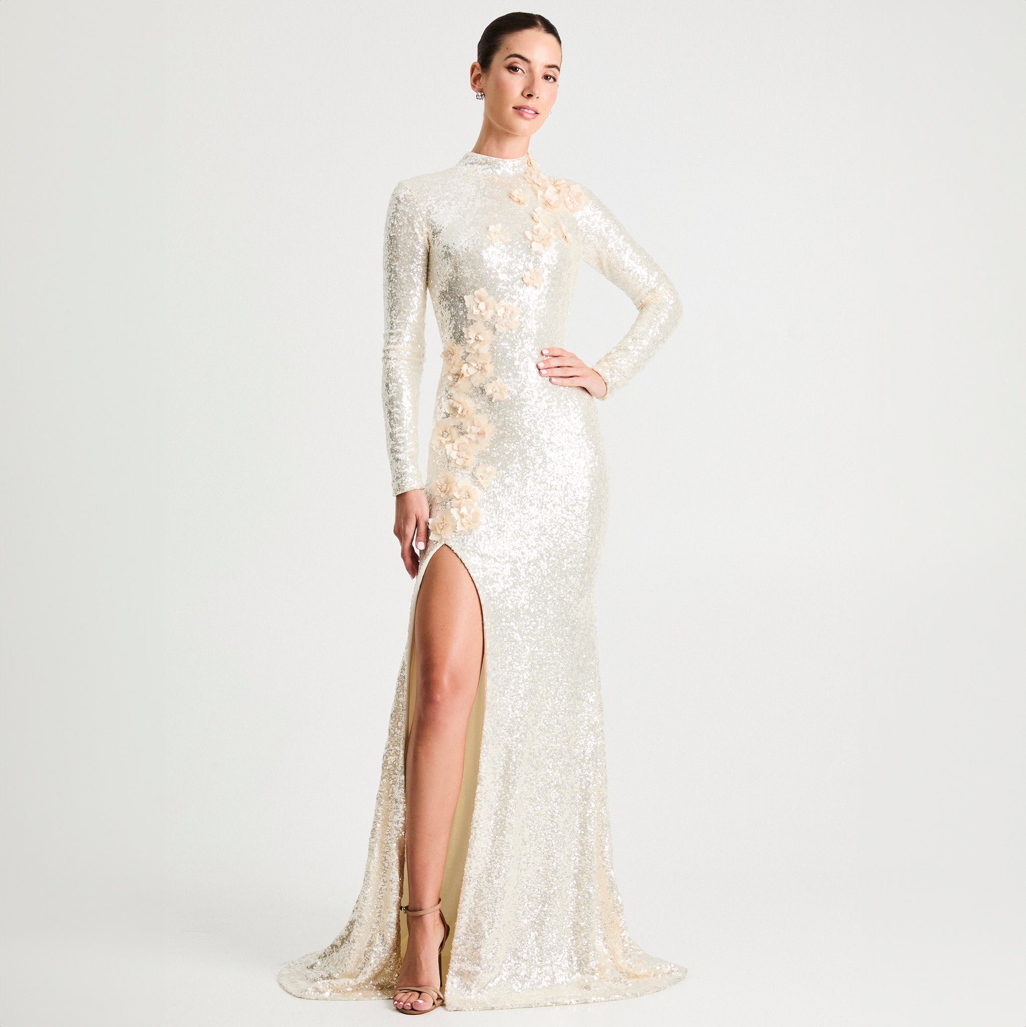 Fitted 3D Floral Sequin Long Sleeve Gown